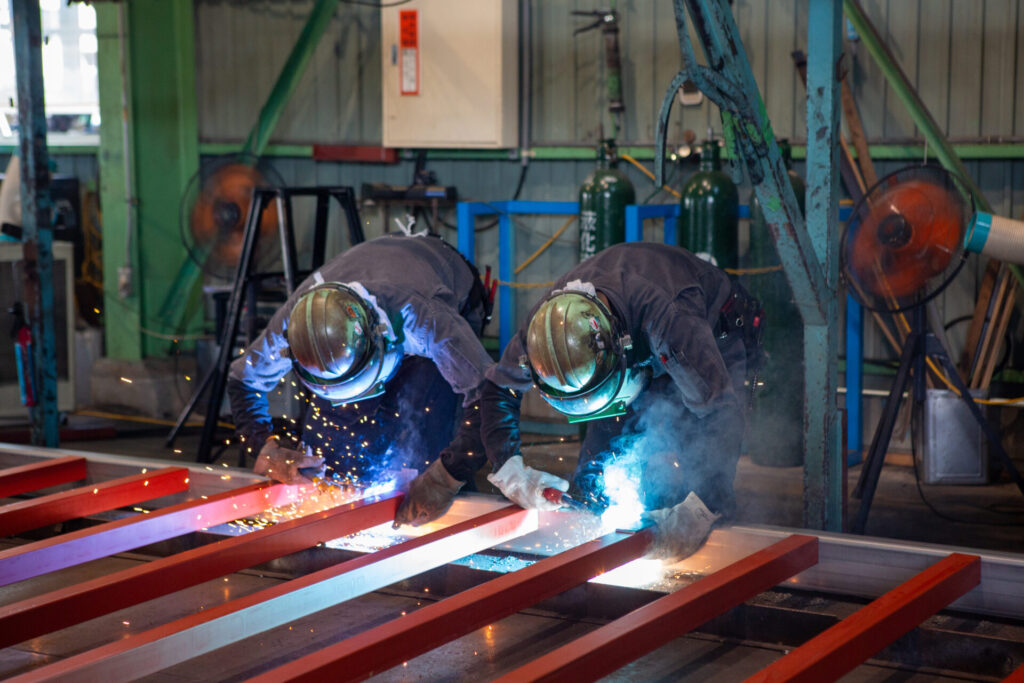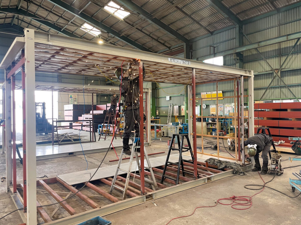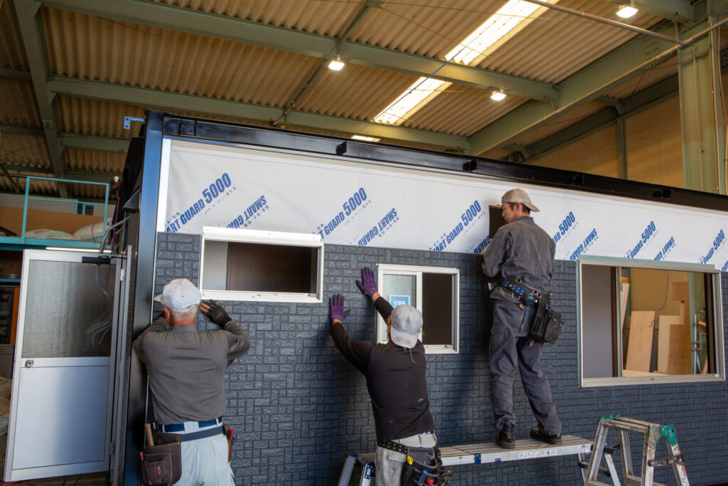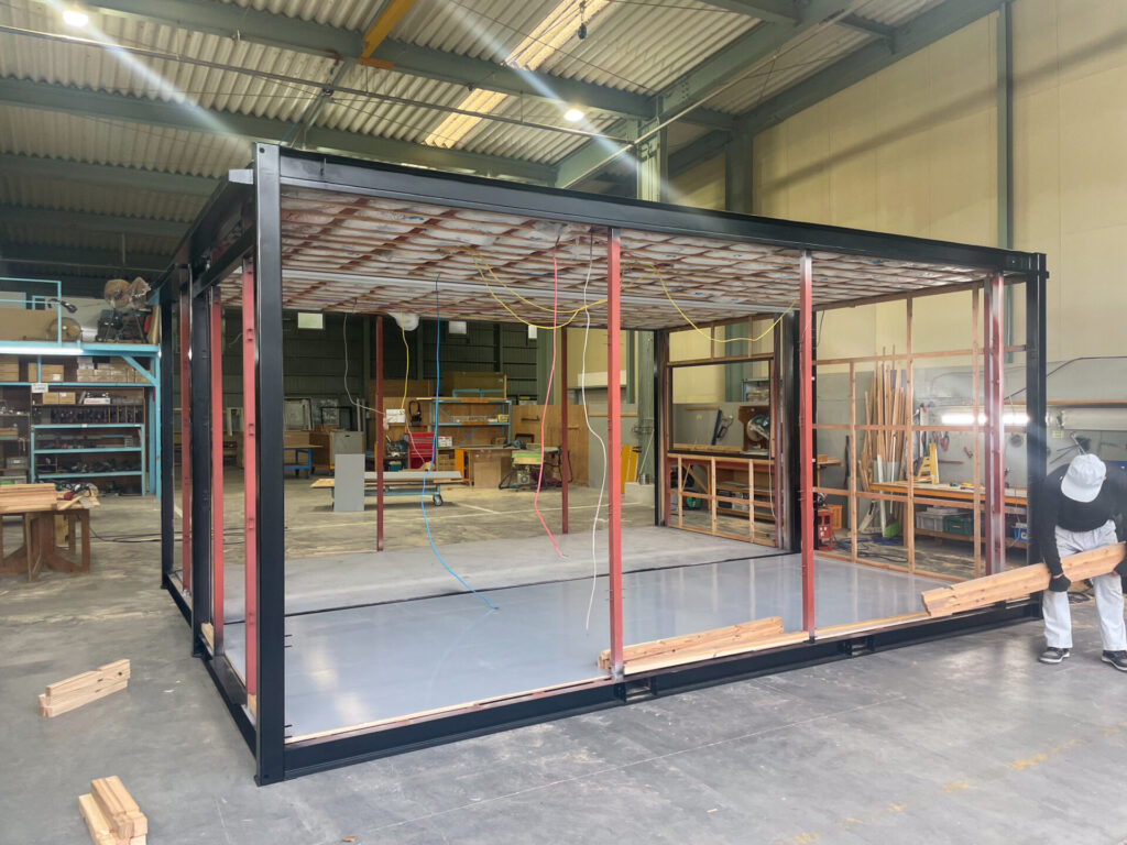 1本の柱を加工してユニットハウスの基礎となる骨組みを